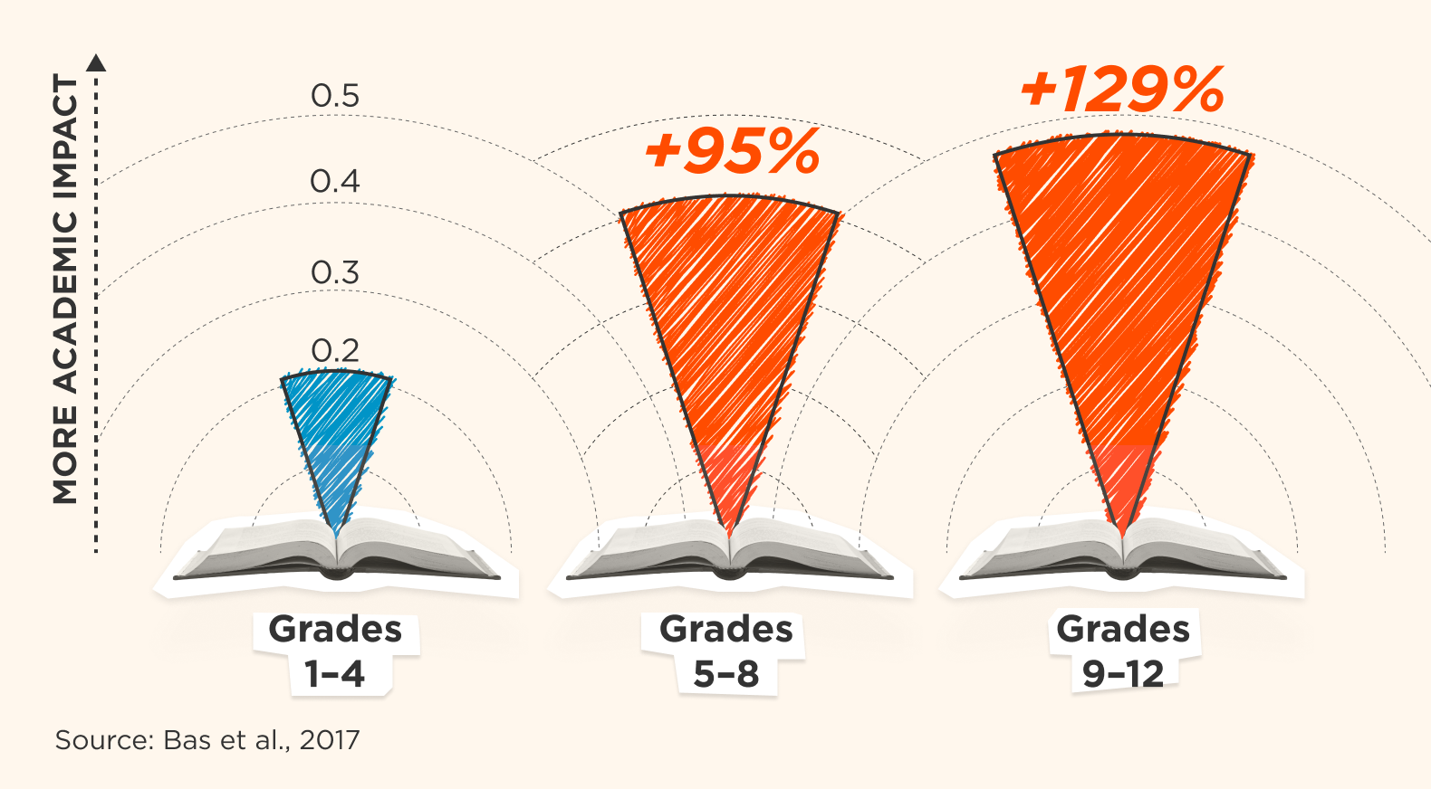 The research reveals a more complex landscape. In a 2017 meta-analysis, researchers found that while the academic impact of homework for students in grades 1–4 is indeed limited—with a small effect size of 0.21—it grows steadily through upper elementary school and into high school, rising by 95 percent for grades 5–8 and 129 percent for grades 9–12, respectively. As students mature and develop the ability to “prepare more elegant and qualified homework as their skills such as problem-solving, critical thinking, cooperative learning, attention, and concentration improve,” the academic value of homework begins to take shape, the researchers say.